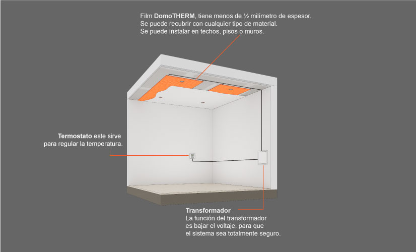 Domotherm utiliza tecnología alemana avanzada para proporcionar calefacción eficiente mediante un film delgado de menos de ½ milímetro de espesor. Este sistema puede instalarse en Techos, pisos o muros ofreciendo una distribución homogénea del calor y el mejor tiempo de respuesta del mercado.